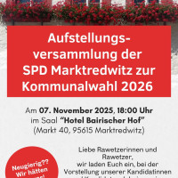 Am Freitag, den 07.11.2025 wurde das gut gehütete Geheimnis gelüftet. Die Kandidaten für den Stadtrat und als große Überraschung, die Oberbürgermeister Kandidatin, wurden bei der Aufstellungsversammlung der SPD im Hotel "Bairischer Hof" vorgestellt. Die Kandidatin für den Oberbürgermeisterposten, Julia Baumann, ist in Marktredwitz geboren, lebt und arbeitet momentan in Rosenheim. Sie war und ist Rawetz stets verbunden und es ist ihre zweite Heimat.