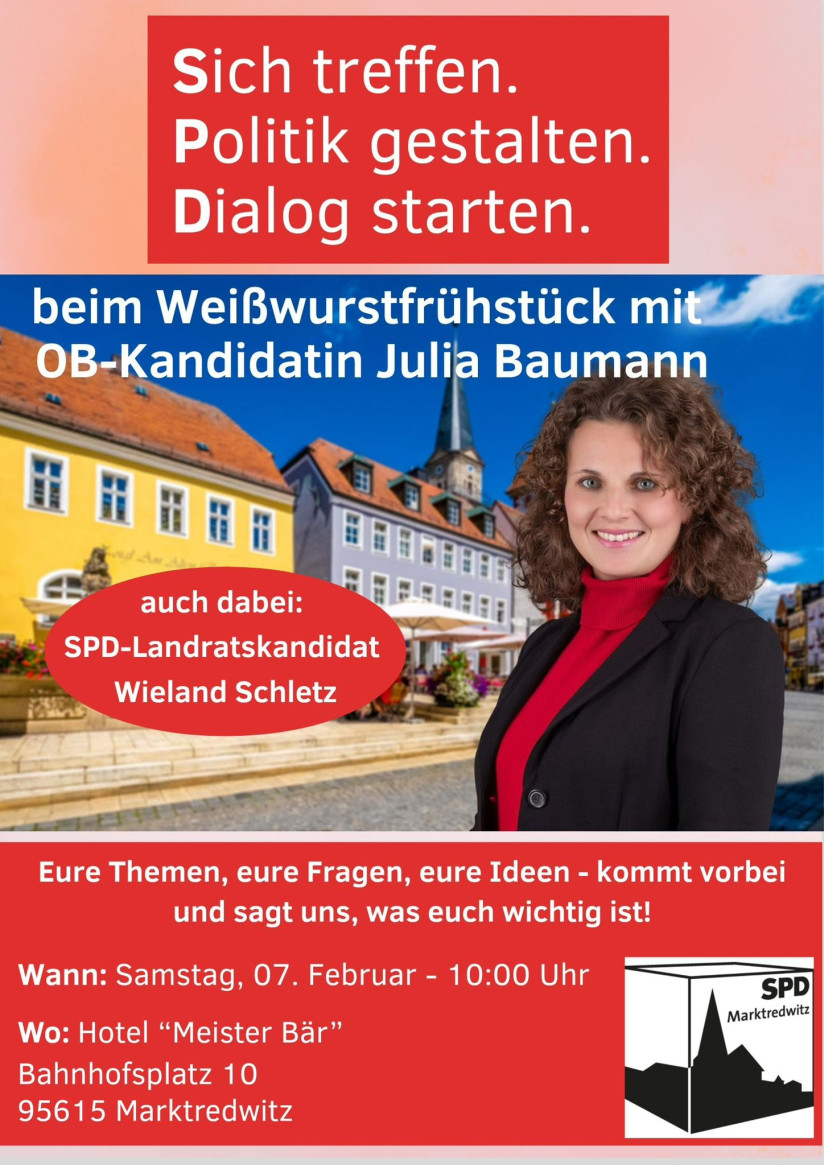 Im Bistro des Meister Bär Hotels wurde bei einem Weißwurstfrühstück die OB-Kandidatin Julia Baumann, die anwesenden Stadtratskandidaten sowie der Landratskandidat Wieland Schletz vorgestellt. Im Anschluss ergaben sich viele interessante Gespräche.