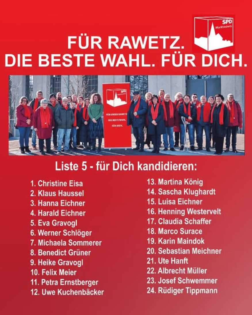 Am Freitag, den 07.11.2025 wurde das gut gehütete Geheimnis gelüftet. Die Kandidaten für den Stadtrat und als große Überraschung, die Oberbürgermeister Kandidatin, wurden bei der Aufstellungsversammlung der SPD im Hotel "Bairischer Hof" vorgestellt. Die Kandidatin für den Oberbürgermeisterposten, Julia Baumann, ist in Marktredwitz geboren, lebt und arbeitet momentan in Rosenheim. Sie war und ist Rawetz stets verbunden und es ist ihre zweite Heimat.